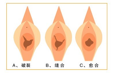 三、缝合与粘贴。处女膜修复手术过程,消毒完毕后,手术医生用眼科小剪刀将破裂处的处女膜剪出整齐的创缘,再用7-0的尼龙线细细缝合,使处女膜仅留通过一小指的孔,术毕涂少许抗生素软膏,术后每天用0.1%的新洁尔灭液清洗外阴部以预防感染。